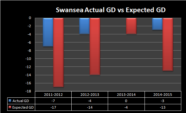 Just as an experiment, I tried to see if any other teams over the last 4 seasons have overperformed to the extent that Swansea have. The criteria I used is in three of the last four seasons, a team has had to have an actual – expected goal difference of at least 10 or more goals. This is what I found: